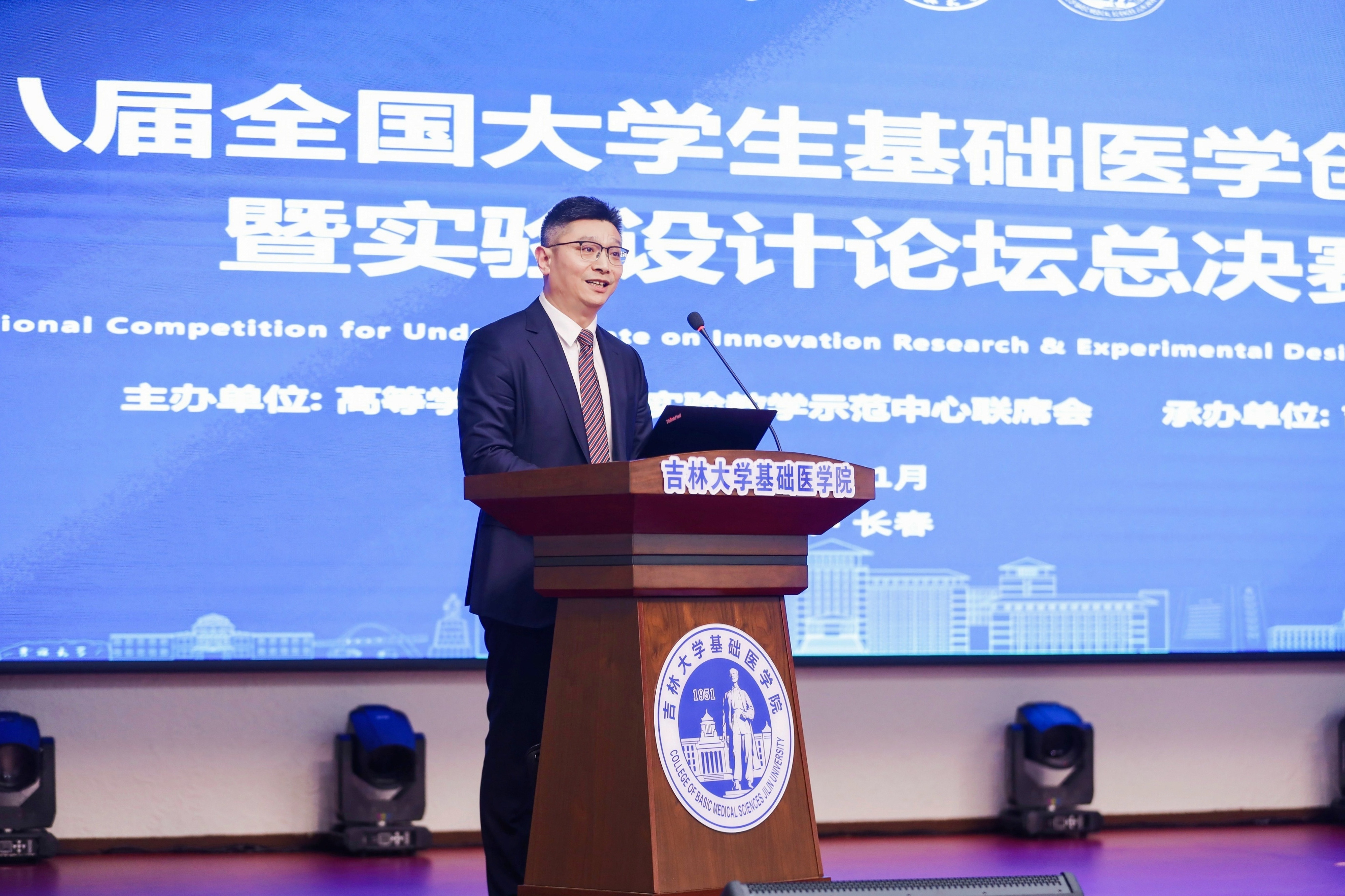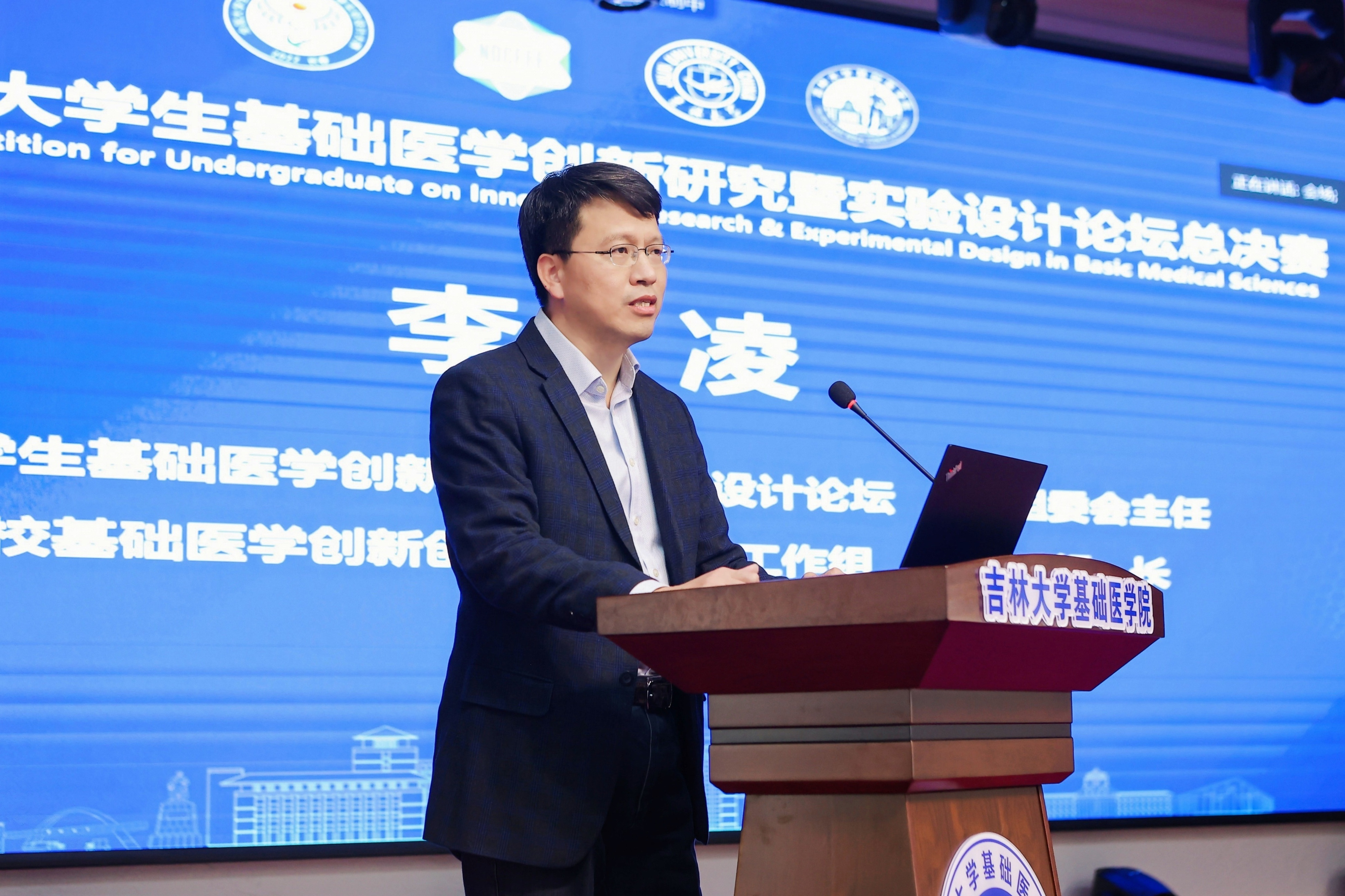 全国大学生基础医学创新研究暨实验设计论坛组委会主任、高等学校基础医学创新创业协同育人工作组组长、南方医科大学李凌教授做决赛总结致辞。他首先向吉林大学姜治莹书记对本届大赛的大力支持表示衷心的感谢,并对承办本届总决赛的吉林大学和必赢bwin线路检测中心师生们付出的辛勤劳动给予了高度认可。同时,他总结了在前七届大赛基础上,本届总决赛的三大亮点,即首次以线上直播形式开展、首次以线上线下相结合方式进行评审监督、首次增开法医学、中医药、预防医学赛道。