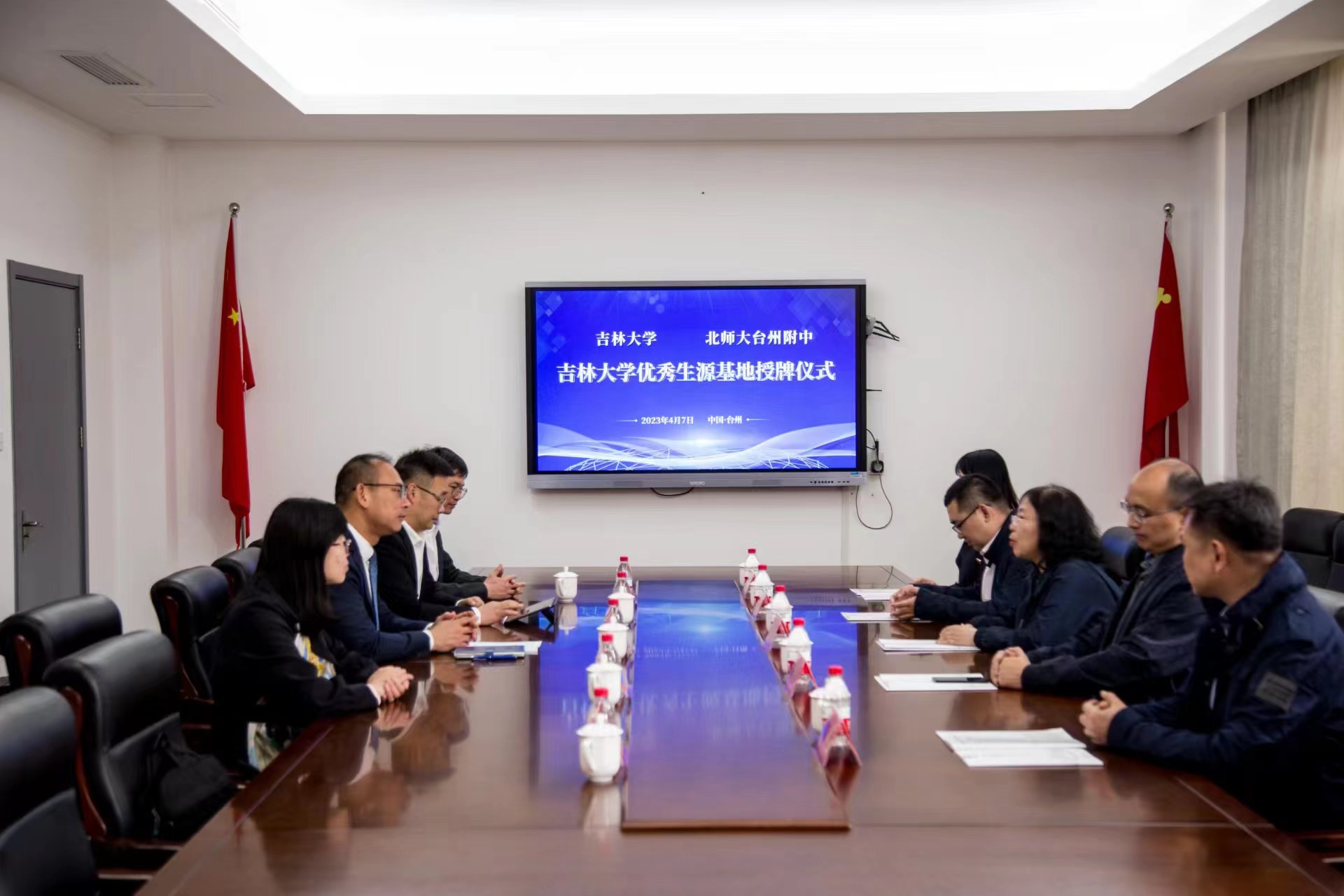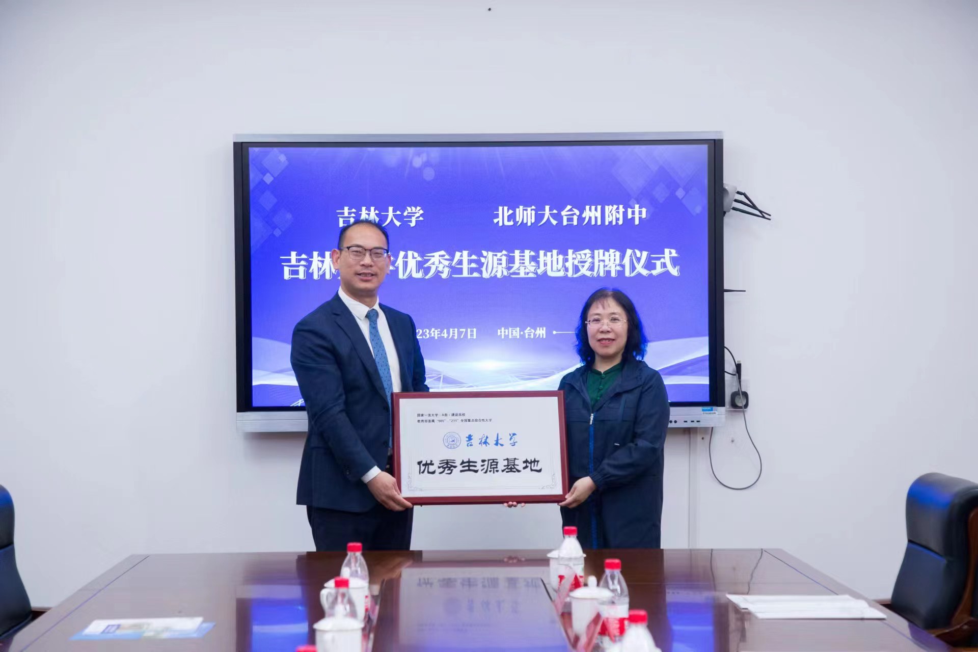 4月7日下午2:00,必赢bwin线路检测中心党委书记王晓荣教授、陈龙副院长带领免疫学系李冬教授、生理学系章宏副教授和党委办公室夏燕来主任组成的教师团队走进浙江省台州市北京师范大学台州附属高级中学(以下简称北师大台州附中)开展招生宣传工作,并举行“吉林大学优秀生源基地”授牌仪式。北师大附中党委副书记徐林建、副校长徐立海、副校长王林军、党委委员张宏辉、拔尖创新课程中心主任叶阳中以及高三学部主任陈赛出席活动。