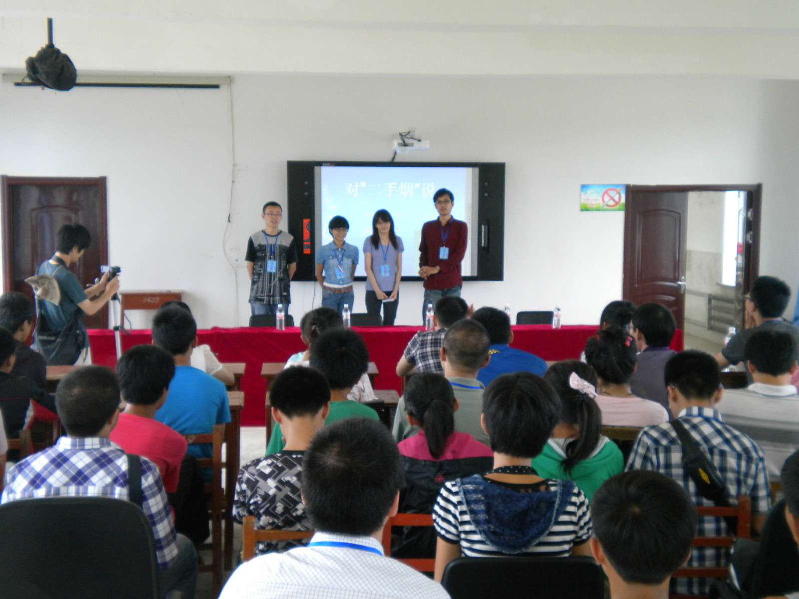 8月9日,师生一行来到杨木林镇中学,为这里的中学生们做二手烟防治的宣讲,四名主讲同学用精心准备的ppt为中学生们生动的讲解了什么是二手烟、二手烟的危害、如何防范二手烟,并在现场做了有奖征答的互动环节,宣讲结束后,大学生同学们走到中学生同学们中间,在三高防治、学习、生活等方面做了相互交流。