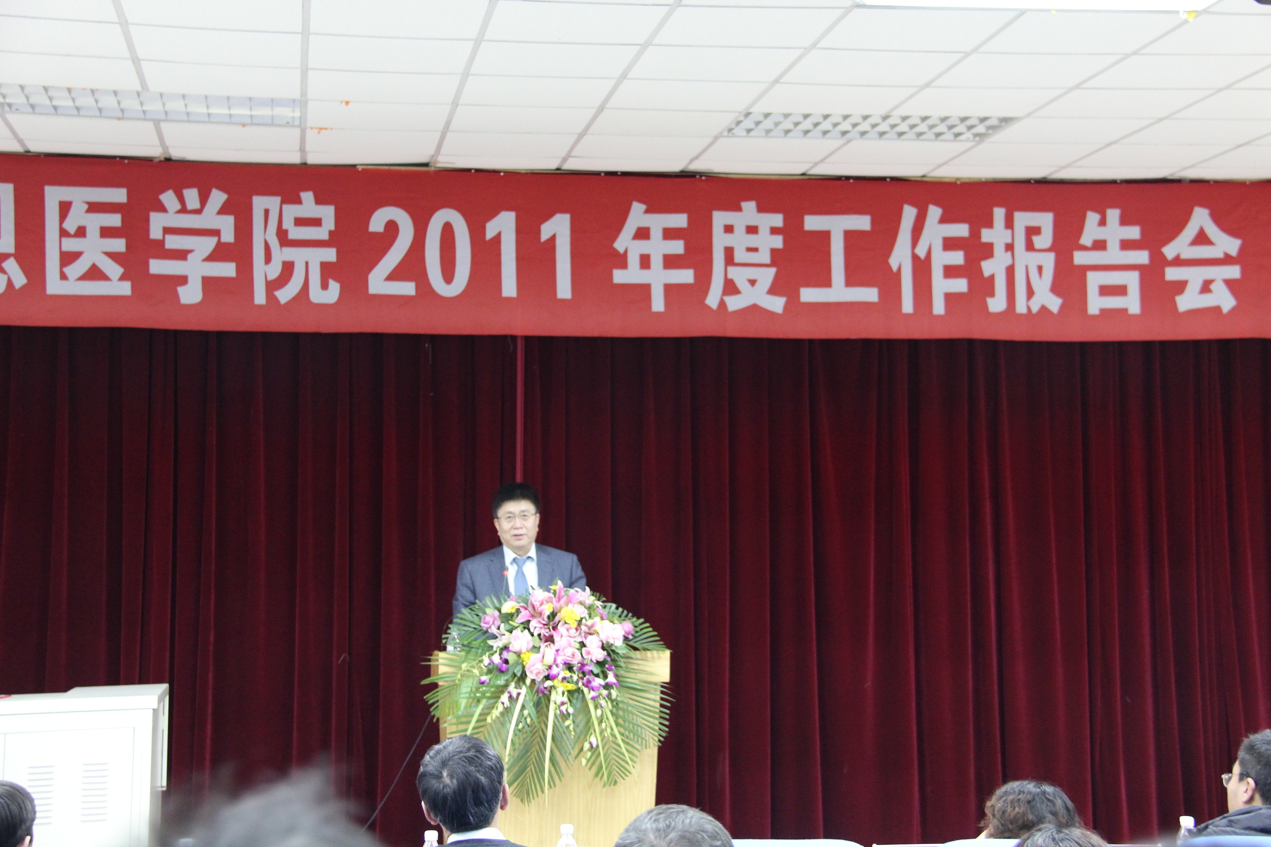 1月13日下午1时30分,白求恩医学院在新民校区第二教学楼2402教室召开2011年度工作报告会。副校长王冠军、学校检查调研组成员董德明、田文晶、张国兴、闫国栋、郝彦辉出席了报告会,学院党委委员、二级教代会代表、学术委员会委员、学位评定委员会委员、教学工作委员会委员、离退休职工代表、党支部书记、学生代表参加了报告会,会议由白求恩医学院行政副院长、学院教代会秘书长韩丽华主持。