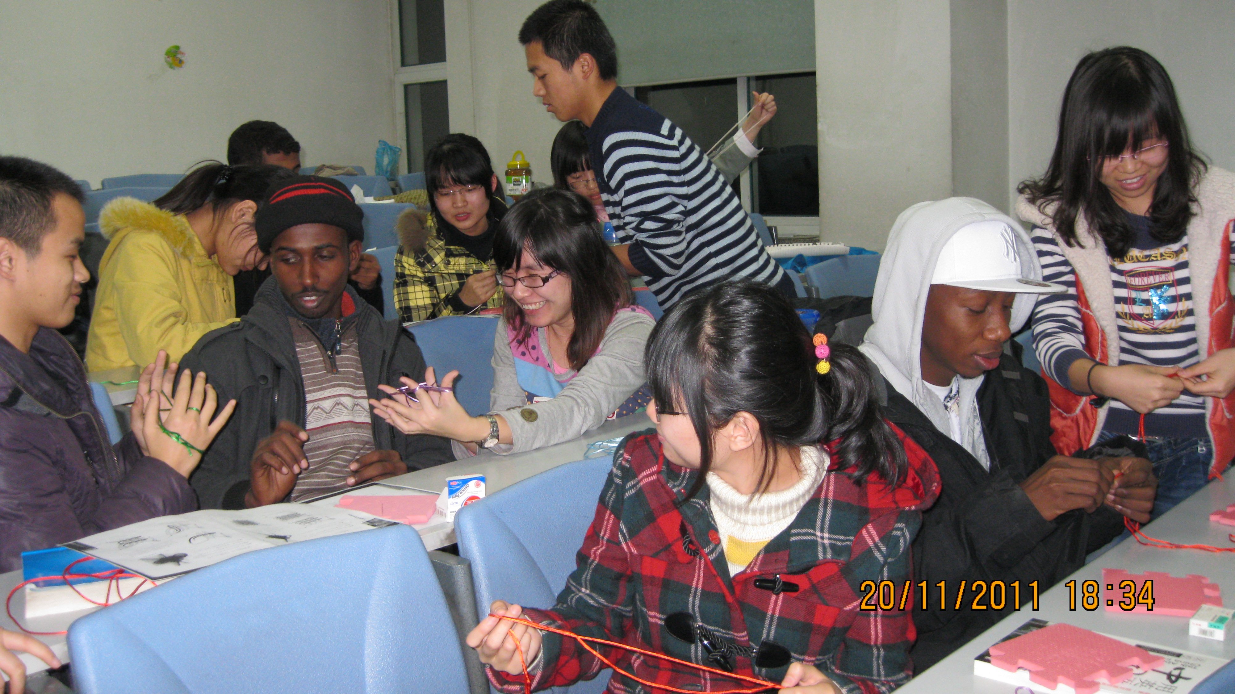 为帮助留学生了解中国文化,增进中外同学感情,11月20日下午,由白求恩医学院留学生办公室、阳光志愿者协会项目部和“千千情结”编织协会共同在新民校区第二教学楼2204教室举办了“交织友情—中外学生共编中国结”活动,30余名学生参加了此次活动。