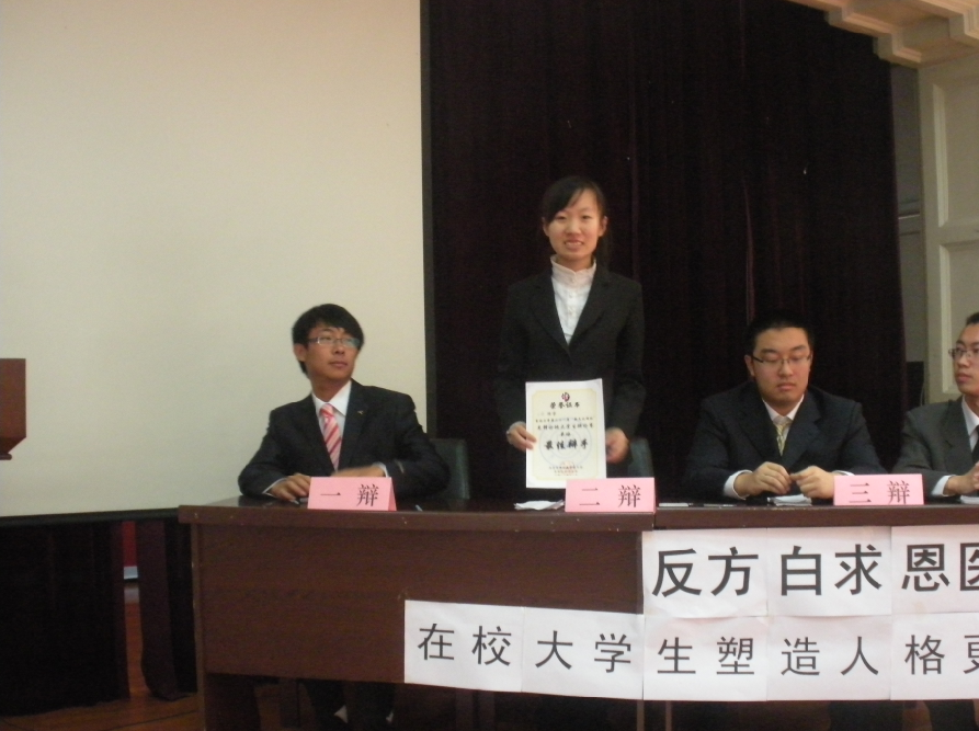 10月29日上午,吉林大学第二十一届“新文化网杯”先锋论坛大学生辩论赛初赛在基础楼二楼多功能学术报告厅举行。本场辩论赛的正反方分别为白求恩医学院代表队与口腔医学院代表队。双方就“在校大学生应注重积累知识还是塑造人格”展开了激烈的辩论。