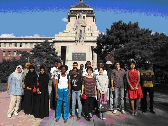 然后,以医学院办公楼为起点留学生们参观了校园及周边的环境,整个过程留学生们热情高涨,气氛融洽,笑语不断。讲解人秉着既不忽视生活细节又普及校园文化的原则,不但对沿途的超市,药店,医院等建筑进行说明,也为大家讲解了校园内的设施文化历史和学校的骄人成绩,如基础楼前的白求恩像等,还对长春的天气,景点,商业街,美食文化等也都进行了一一介绍,同学们兴趣盎然,认真倾听,对这次校园之旅充满期待,并不时提出自己的疑问,讲解人也尽量提些问题让大家来回答以提高同学们的积极性,使气氛更加热烈,尤其是在文化广场,同学们对广场四方的塑像都很好奇,不停的问着它们都代表着什么含意,兴趣浓厚。很多同学留影纪念,感叹不已。