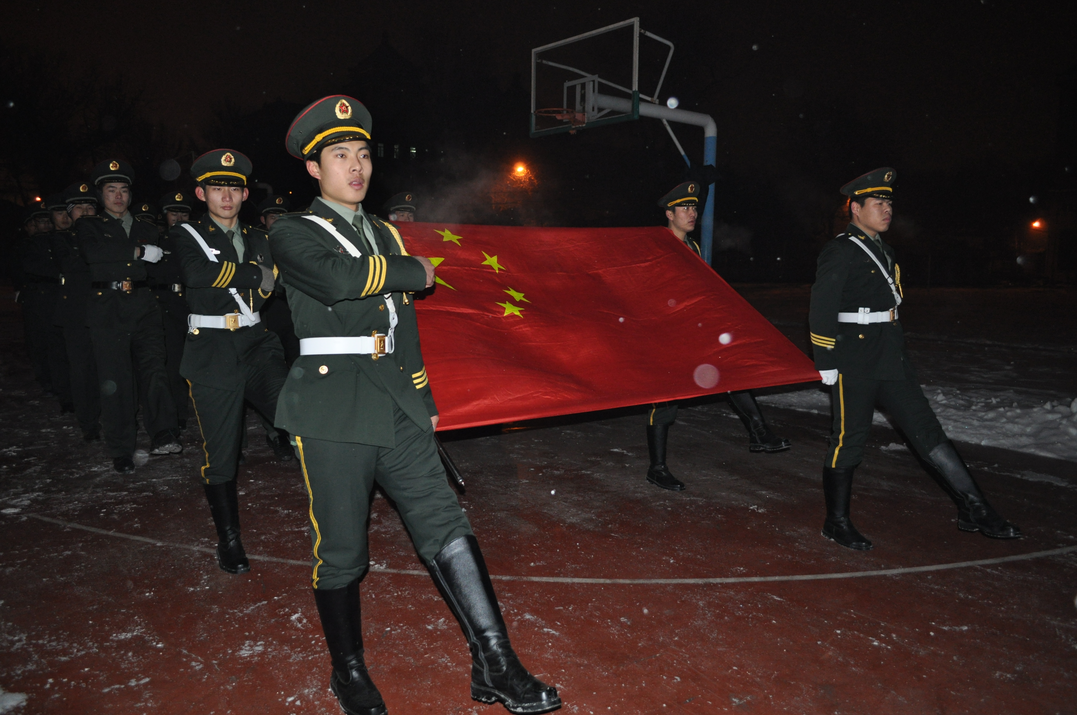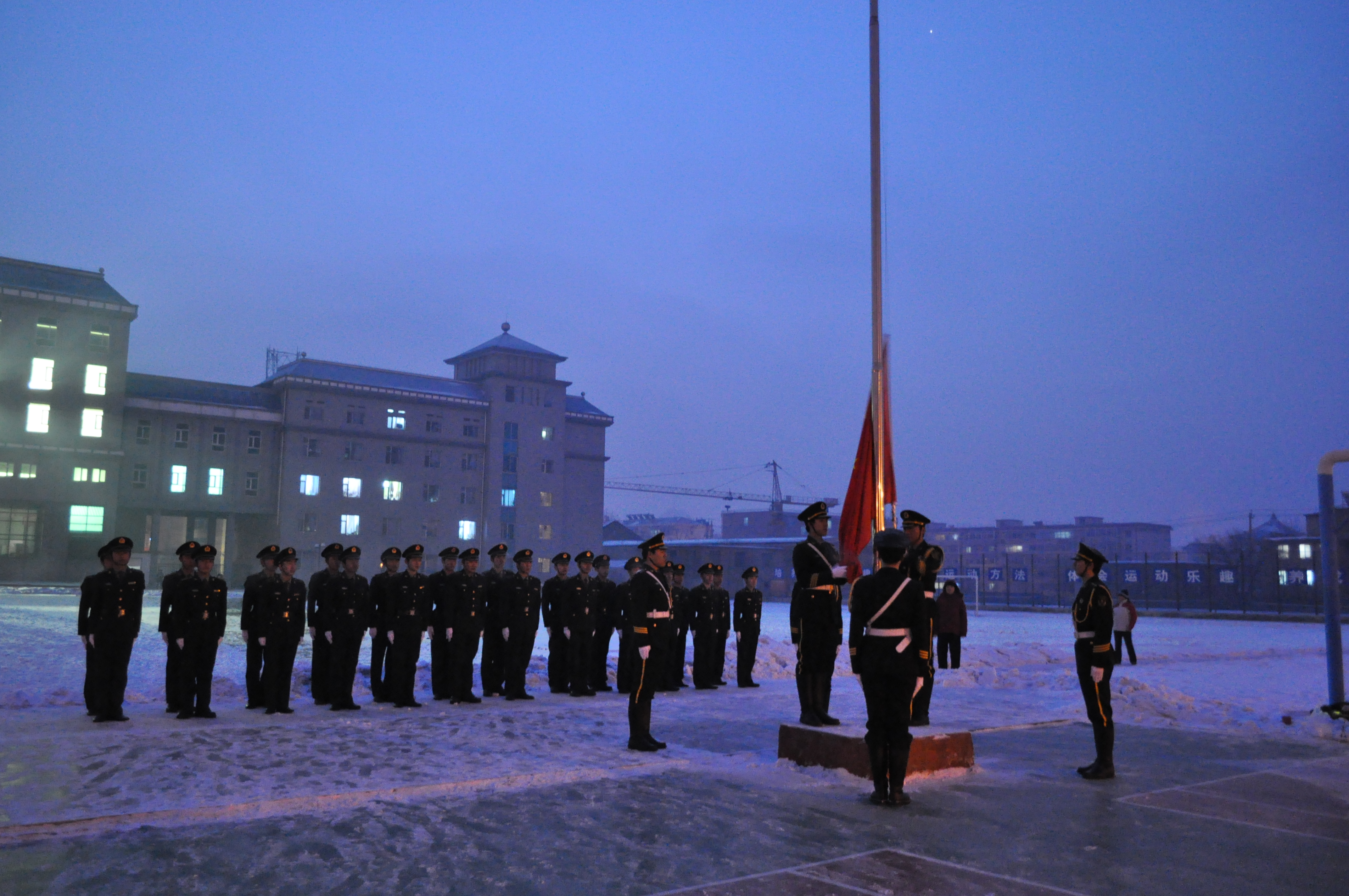 为弘扬爱国之情,树立报国之志,进一步追忆历史、增强同学们的爱国意识与责任感,12月9日早上6点钟,白求恩医学院在新民校区体育场举行“勿忘国耻,振兴中华” 纪念一二•九升旗仪式,驻吉林大学选培办参谋张勇、白求恩医学院团委书记夏燕来、白求恩医学院全体学生干部、全体国防生以及部分学生代表参加了此次升旗仪式。