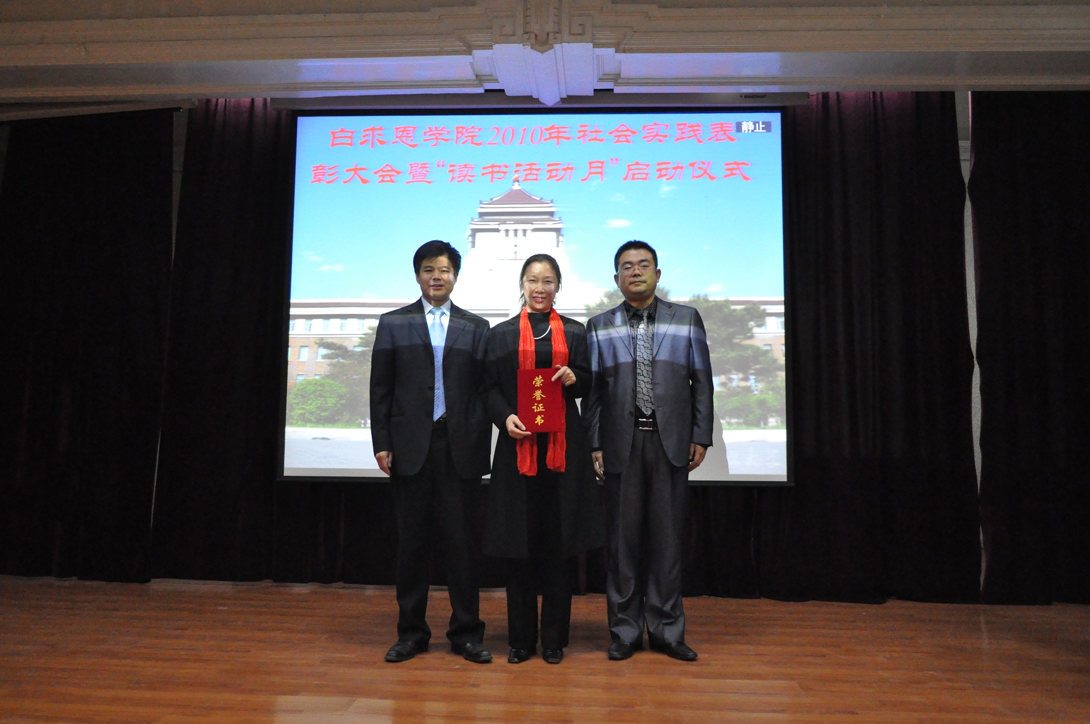 首先,团委副书记李玲玉对2010年暑期社会实践活动进行了总结,团委副书记李梓萌对扶残助残和残疾人调研专项活动做了汇报。白求恩医学院本年度的社会实践工作部署早,参与面广,效果明显,涌现出了一批优秀团队和先进个人,撰写了一批高质量的社会实践报告。在表彰大会上,11位获奖代表先后就自己的暑期社会实践做了精彩的发言。才仁卓嘎回到玉树家乡用志愿服务传递永恒的白求恩精神;张滨、林萍等人组成的寻根之旅为牛眼沟村白求恩希望小学的孩子们插上了理想的翅膀;李芳独闯西部高原引发了深深的思索;孟凡会、关伟的残疾人调研小分队搜集了大量详实的资料;周玄博的启智培训学校之行告诉我们知福、惜福、再造福;曲垠梦、牟胜男分别为敬老院带去欢乐与关怀。获得特别贡献奖的牛眼沟村支教团指导教师张纪周也讲述了自己的感受与体会。