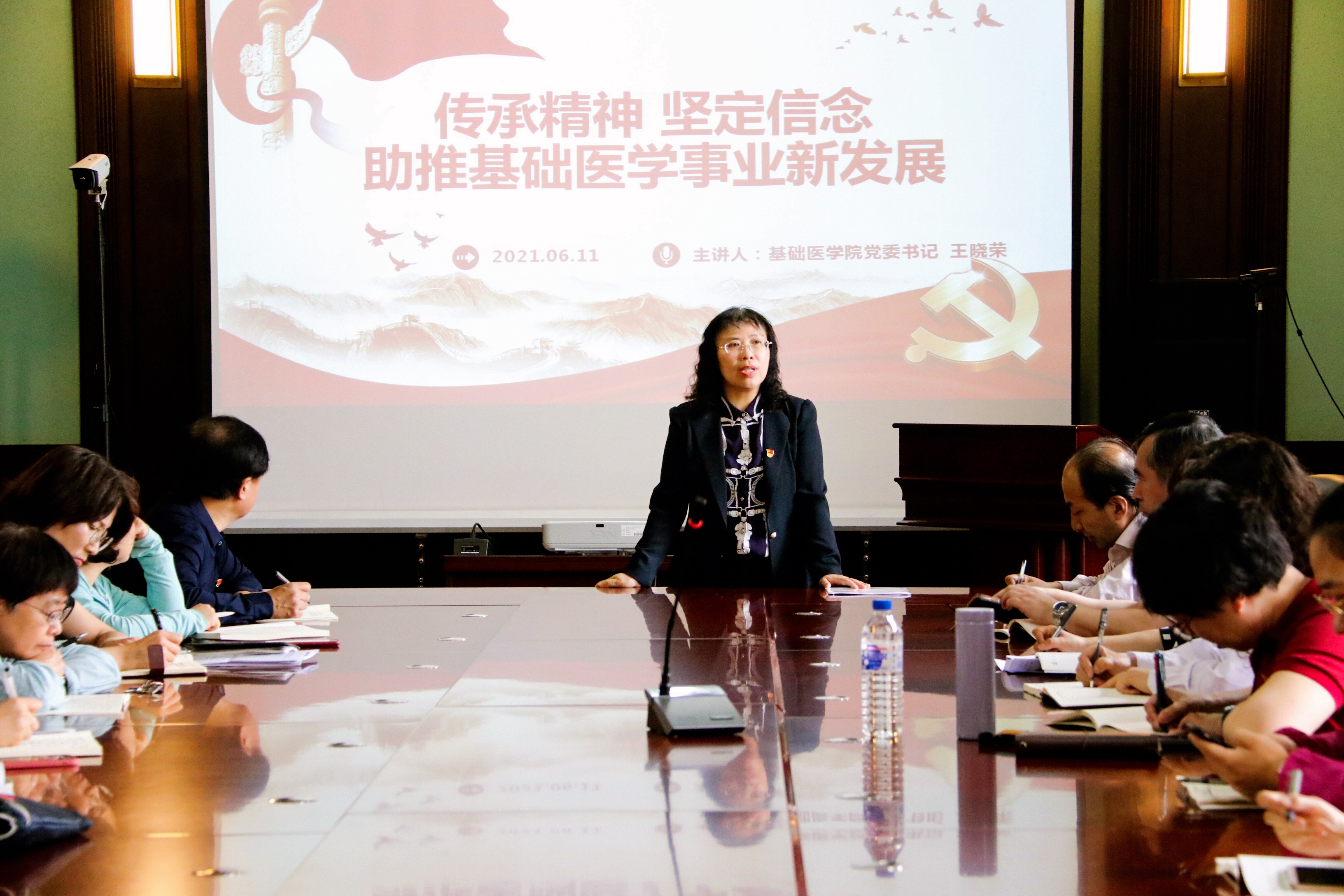 王晓荣书记带领大家从“两个务必”讲起,从共产党人的初心、使命和奋斗目标讲起,她与全体党员共同交流:2021年是极其特殊的年份,既是庆祝我们党百年华诞的重大时刻,又是十四五开局之年,是“两个一百年”奋斗目标历史交汇的关键节点,百年未有之大变局给共产党员提出了问题与挑战,她深入浅出的解读了党史学习教育的重要性。最后,王书记结合学院历史和发展的现状以及党史学习教育的核心内涵总结了学院精神。她指出学院精神是由三种精神融合而来,即白求恩精神、革命军队的优良传统以及学院建院精神,最后形成了基础医学人艰苦创业、服务国家、顾全大局的奋斗精神,形成了孜孜不倦、严谨求真、开拓创新的科学精神。2021年是必赢bwin线路检测中心建院70周年,基础医学学科历经82年的发展历程,她强调基础人要凝聚力量,振奋精神,为医学事业的发展积极进取,努力拼搏。