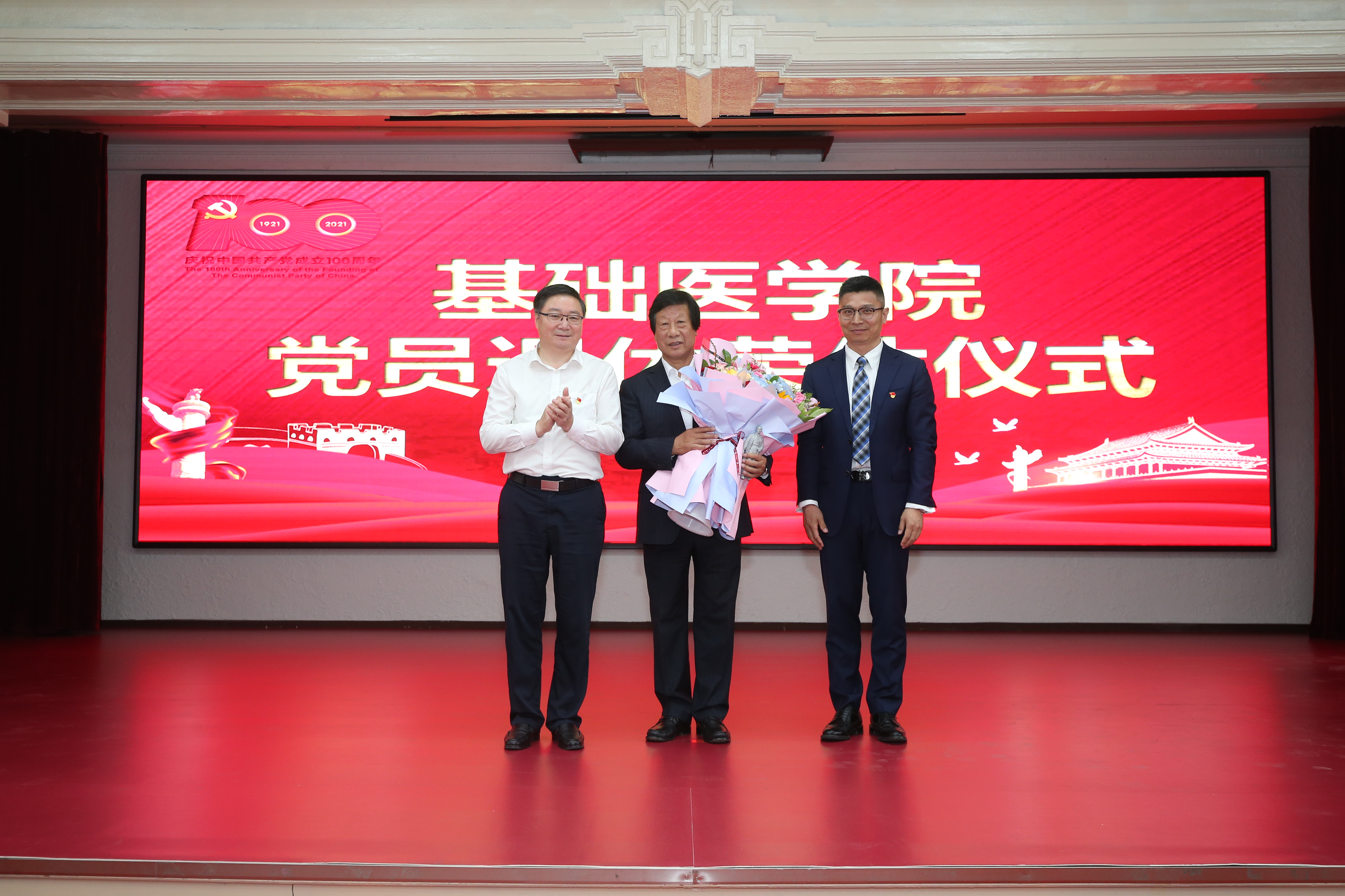 随后进行了必赢bwin线路检测中心首次党员退休荣休仪式。王晓荣书记介绍了2021年退休的李玉林、李一、王琳三位党员教授的基本情况,李玉林教授参加工作52年、党龄49年,李一教授和王琳教授党龄34年,赵国庆副校长为退休党员代表李玉林教授颁发纪念章和3D打印的同版白求恩小塑像,王放院长代表学院赠送了鲜花。李玉林教授在发言中讲到自己从一名知识青年到教授、博士生导师的奋斗经历,表达了热爱党和国家、热爱学校、热爱学院、热爱病理学科的真挚情感,展现了一名老共产党员的精神风范,得到现场师生的热烈掌声。